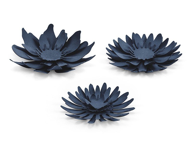 3 stycken detaljerade blomsterdekorationer av mörk marinblått papper. De 3 blommorna har olika utseende och storlek.