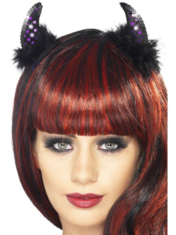 Svarta djävulshorn med marabou fjädrar och lila paljetter.