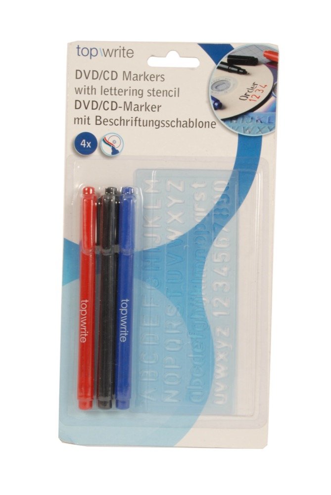 Tre märkpennor i olika färger för DVD och CD. Dessutom ingår en stencil för att få alla tecken riktigt snygga och i samma stil.