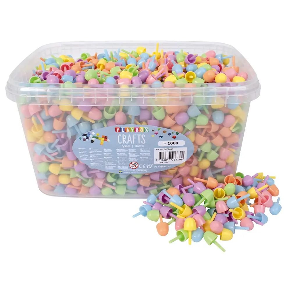Färgmosaik i sex fina pastellfärger med mellanstora piggar, förpackad i en praktisk hink. Perfekt för kreativa barn som vill skapa egna mönster och motiv genom att kombinera färger på olika sätt.