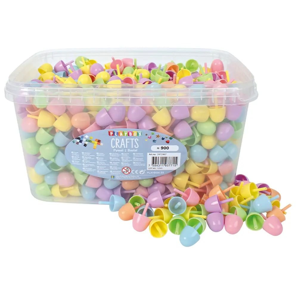 Färgmosaik i sex fina pastellfärger med stora piggar, förpackad i en praktisk hink. Perfekt för kreativa projekt där du kan skapa egna mönster och motiv genom att kombinera färger på olika sätt.