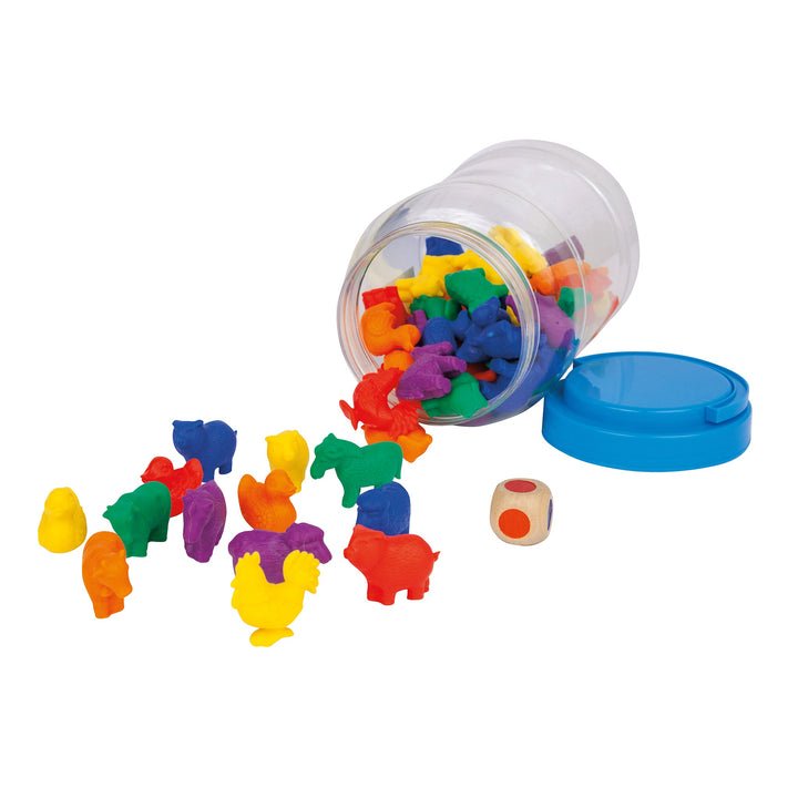Set med 72 bondgårdsdjur som används för färgsortering, räkning och klassificering i förskola, skola och hemmiljö. Djuren är utformade för att göra matematiska övningar och pedagogiska aktiviteter mer konkreta och engagerande.