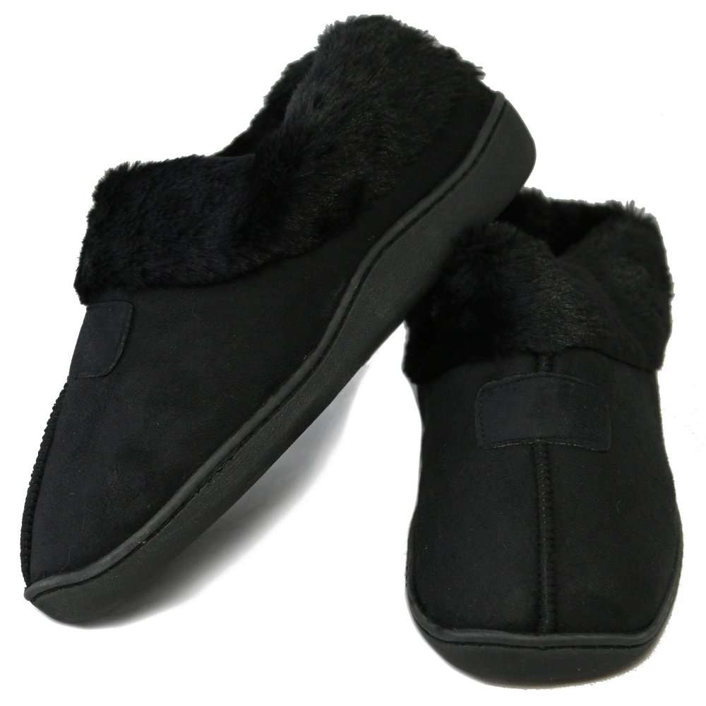 Innetofflor av god kvalité med varmt akrylfoder. Svart innetofflor i mocka- och pälsimitation för både dam och herr med varmt innerfoder med bred pälskant.