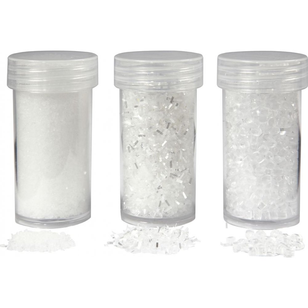 Olika konstgjorda snötyper som kan blandas med bl. a. Sticky Base och användas till dekoration. Används som snöeffekt på papp, trä, terrakotta m. m.