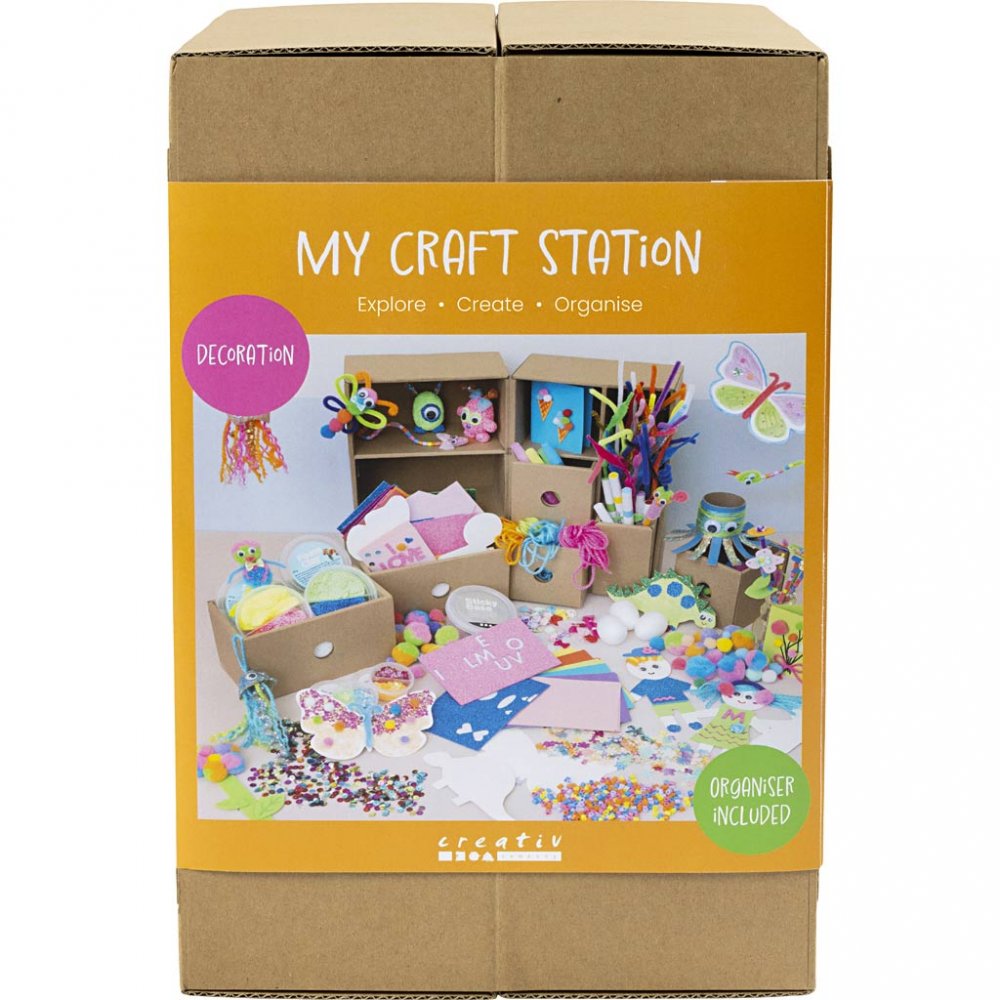 Min Pysselstation är ett dekorationskit med olika material och former som kan användas för kreativa pysselprojekt. Kitet innehåller flera delar som kan dekoreras och kombineras för att skapa egna figurer, dekorationer och små kreativa projekt.
