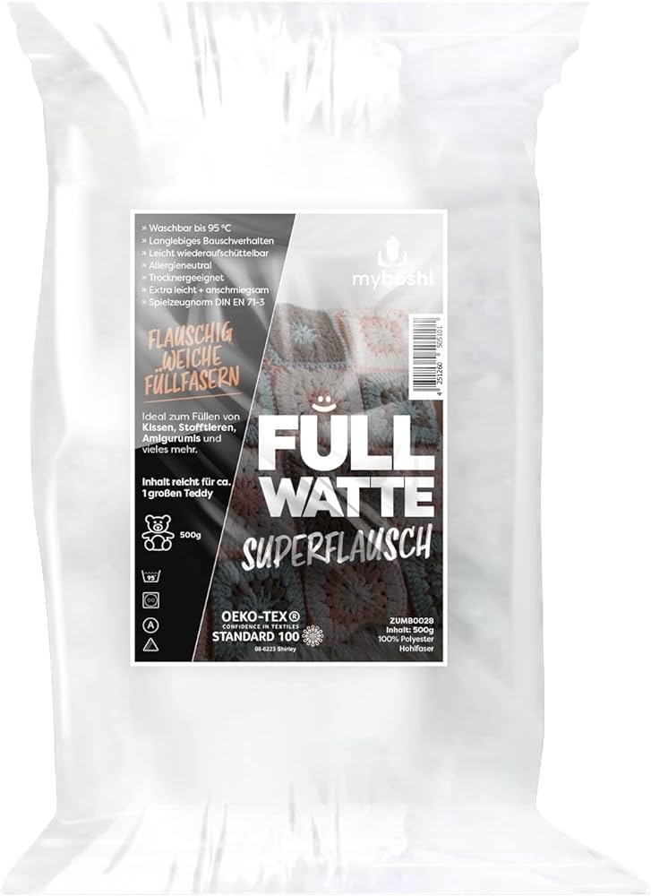 Fluffiga, supermjuka fyllningsfiber. Myboshi-fyllnadsbomull är det perfekta fyllningsmaterialet för amigurumis, gosedjur, kuddar och mycket mer.