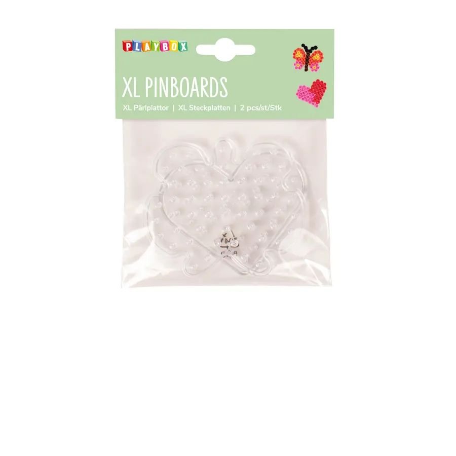 Transparenta pärlplattor i form av en fjäril och ett hjärta, särskilt anpassade för XL-pärlor. Perfekta för mindre barn som vill börja skapa med pärlor på ett enkelt och roligt sätt.