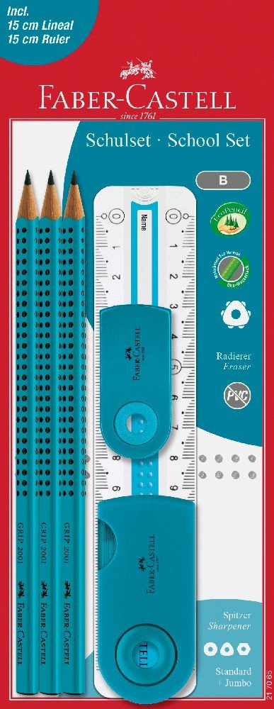 Det perfekta skolsetet. Det här paketet innehåller tre triangulära blyertspennor i hållbart trä med Gripdesign. Färgen är turkos. Suddgummi och pennvässare kommer i Sleeve-design och kan fällas in och ut ur skyddshöljet. En linjal på 15 cm medföljer.
