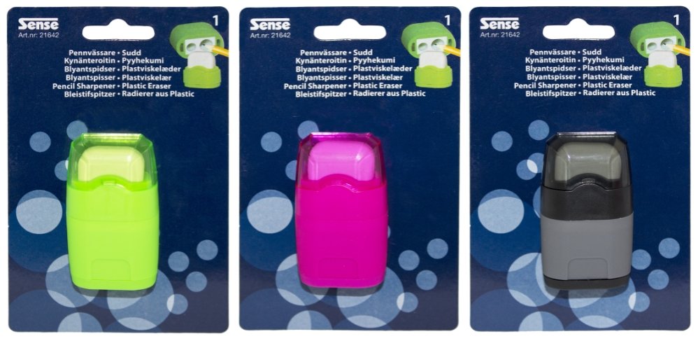 En perfekt kombination av en pennvässare i två olika storlekar med uppsamlare och infattat suddgummi. Finns i färgerna grön, rosa och svart vilken färg som kommer är slumpmässig.