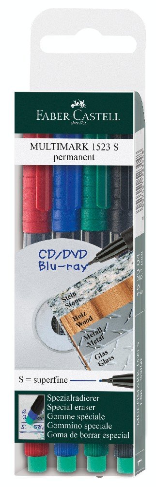 Fyra märkpennor från Faber-Castell med permanent bläck. De kommer i fyra olika färger som du kan använda på diverse släta ytor som plast, sten, metall och trä. Radertoppen går att använda för mindre, snabba korrigeringar.