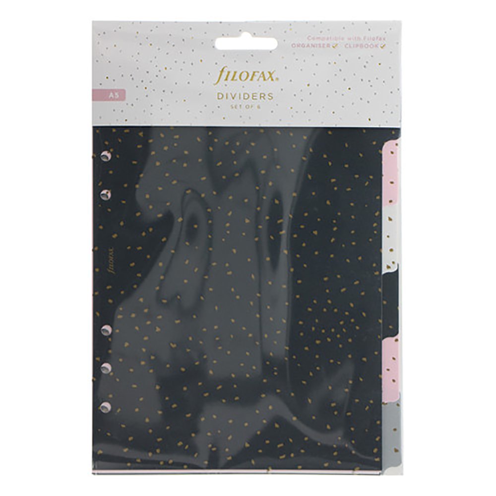 Färgglad uppsättning av sex hållbara indexflikar i plast från Confetti Collection, speciellt utformad för att koordineras med A5 Filofax kalender eller Clipbook. Denna uppsättning innehåller avdelare i svart, rosa, vit och grå färger, tryckta på båda sidor.