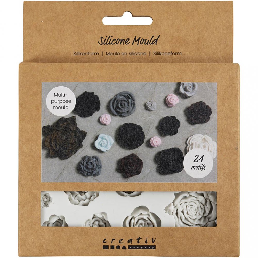 Silikonform med rosmotiv används för att skapa detaljrika dekorationer i material som tvål, stearin, harts, gips och olika typer av modelleringslera. Den flexibla formen gör det enkelt att gjuta små rosor med tydliga detaljer.
