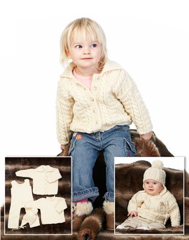 Gratis biskrivning på flätstickad kofta, tröja, byxor och mössa i Superwash Safir.