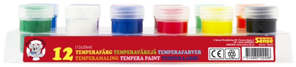 Ett set om 12 st burkar temperafärg. Passar bra att använda på ritpapper, kartong och andra pappersvaror. Varje burk innehåller 20 ml. Ingående färger är svart, röd, ljus grön, gul, brun, orange, rosa, ljus blå, lila, vit, mörk blå samt mörkt grön. Burkarna är integrerade i ett tråg för att inte välta i målarstunden.Skall användas med pensel.
