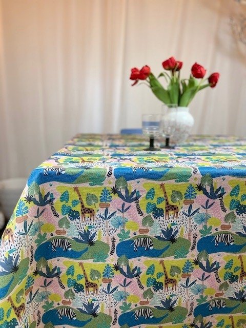 Textilvaxduk med safarimönster som ger en lekfull och dekorativ dukning. Motivet passar bra i både kök och matsal och är även praktiskt vid aktiviteter som pyssel och måltider.