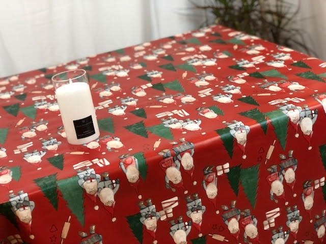 Vaxduk med julmotiv av tomtar och julgranar som skapar en klassisk och stämningsfull dukning under advent och jul. Motivet passar bra vid julmiddagar, julfika och andra vinterliga tillfällen.