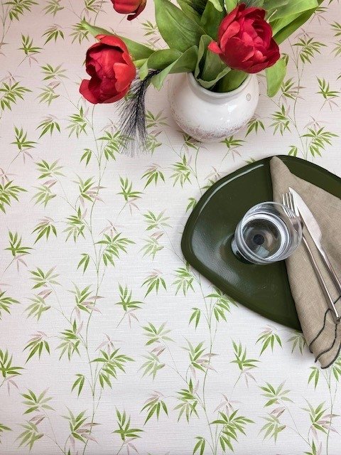 Härlig vaxduk med växter i återvunnet material till 90%. Vaxduken har lite tapetmönstad känsla- den är lätt att torka av och perfekt att ha inomhus och på trädgårdsmöblerna.Miljögodkänd av Oeko- Tillverkad i EU
