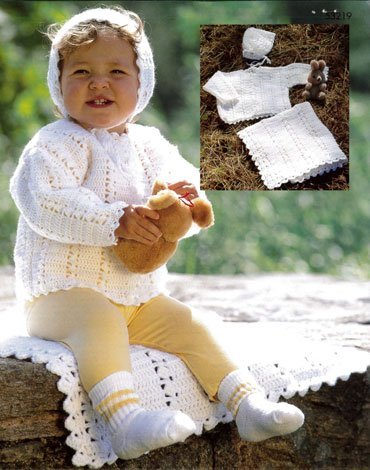 Gratis beskrivning på virkad kofta, hätta och filt i Piggelen